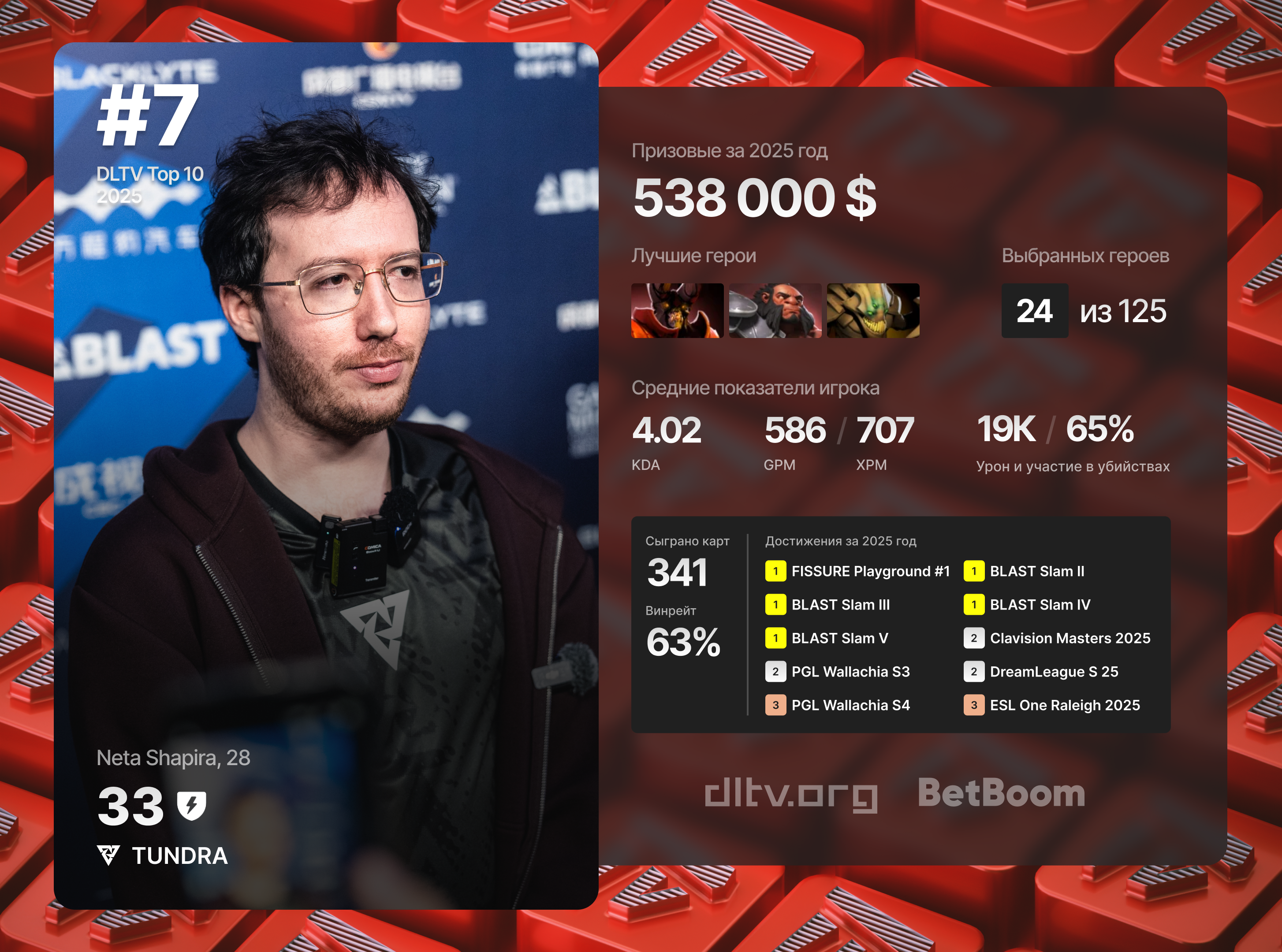在 DLTV.ORG 评选的 2025 年最佳选手榜单中,第七名是效力于 Tundra Esports 的劣势路选手兼队长 33。在 2024 年,他排名第 9。
