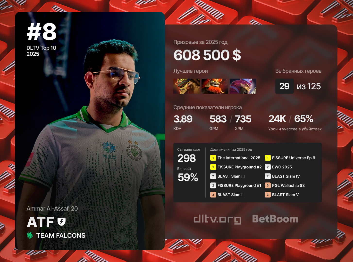 在 2025 年,ATF 开通了自己的 Telegram 频道,定期与社区分享他的想法以及各类赛事的总结,同时还承担起队伍队长的角色,因此他不得不投入大量精力和时间去准备 BP 和战术,这在一定程度上影响了他的 KDA 和整体数据。尽管如此,在这一整年里,我们都能看到 ATF 的成长——无论是作为一个愿意为战队及其成绩承担全部责任的领袖,还是作为一名打法非传统、凭借个人实力与非常规劣势路英雄(例如:Ursa、Slark、Monkey King、Ember Spirit)而极为抢眼的选手。在 2025 年的 298 张比赛地图中,ATF 总共只使用了 29 个英雄。凭借这些冠军以及在各类赛事中的高名次,这名选手已经获得了超过 60 万美元的奖金。