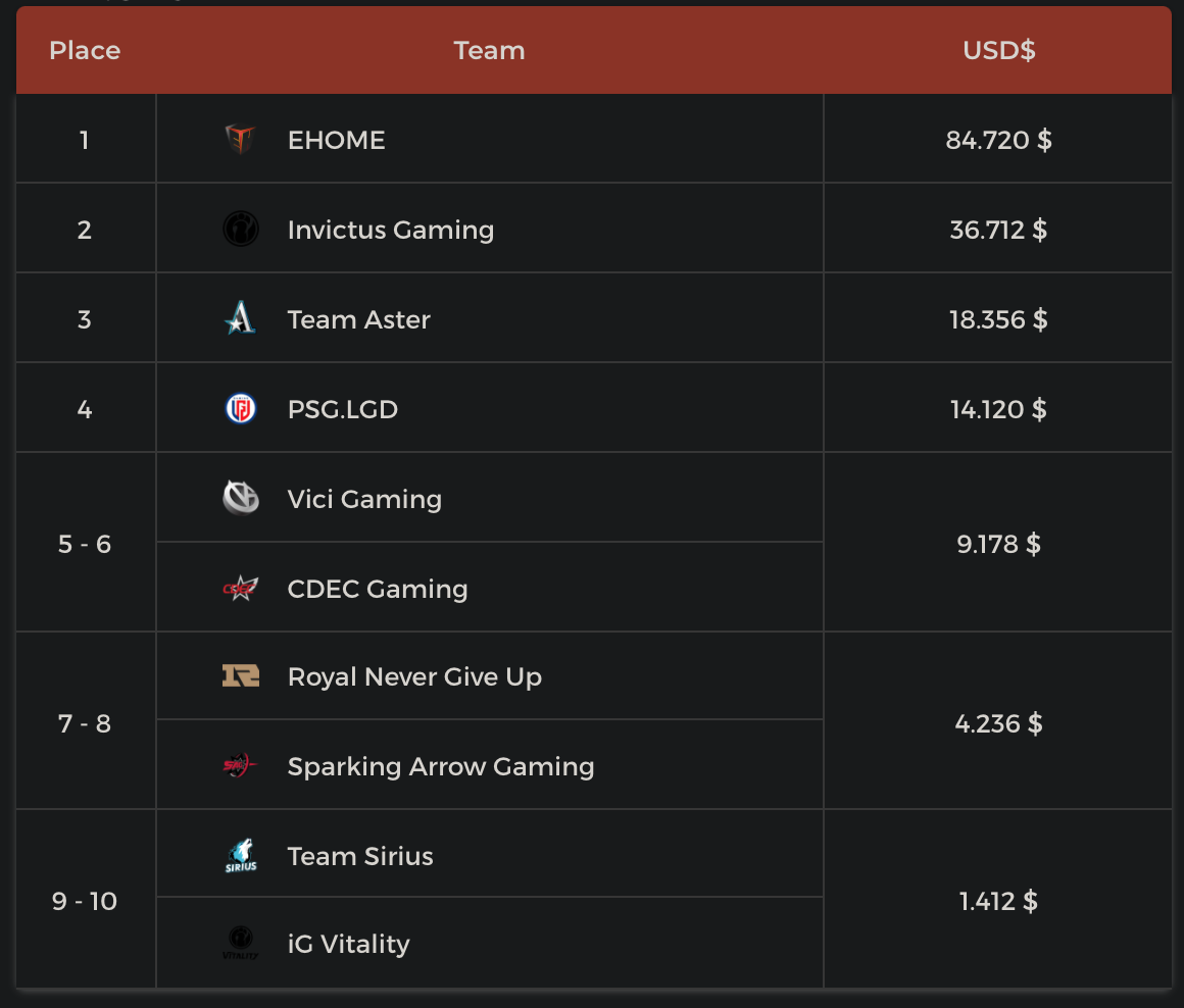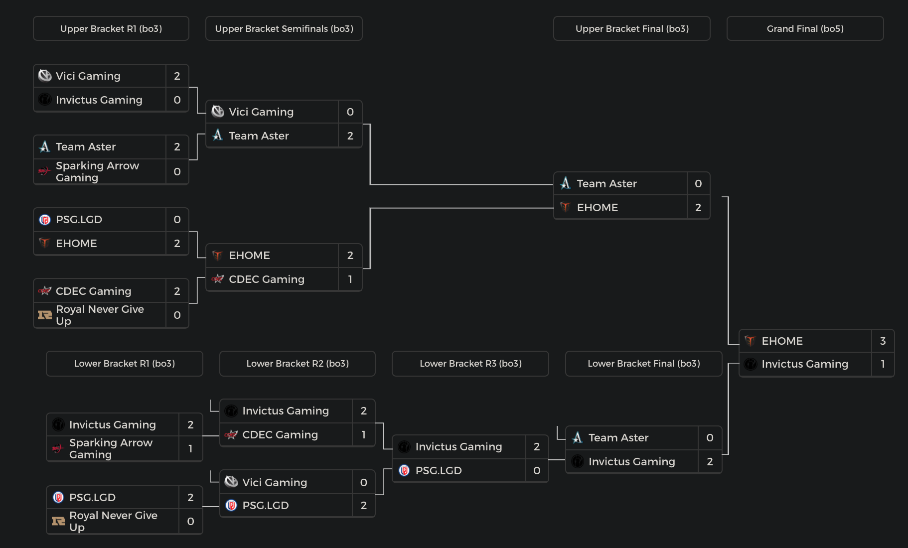 EHOME and Invictus Gaming met in a match for the champion title. The teams had to play in the BO5 series, where EHOME, having given only one map, beat their rival and finished the match with a 3:1 score.