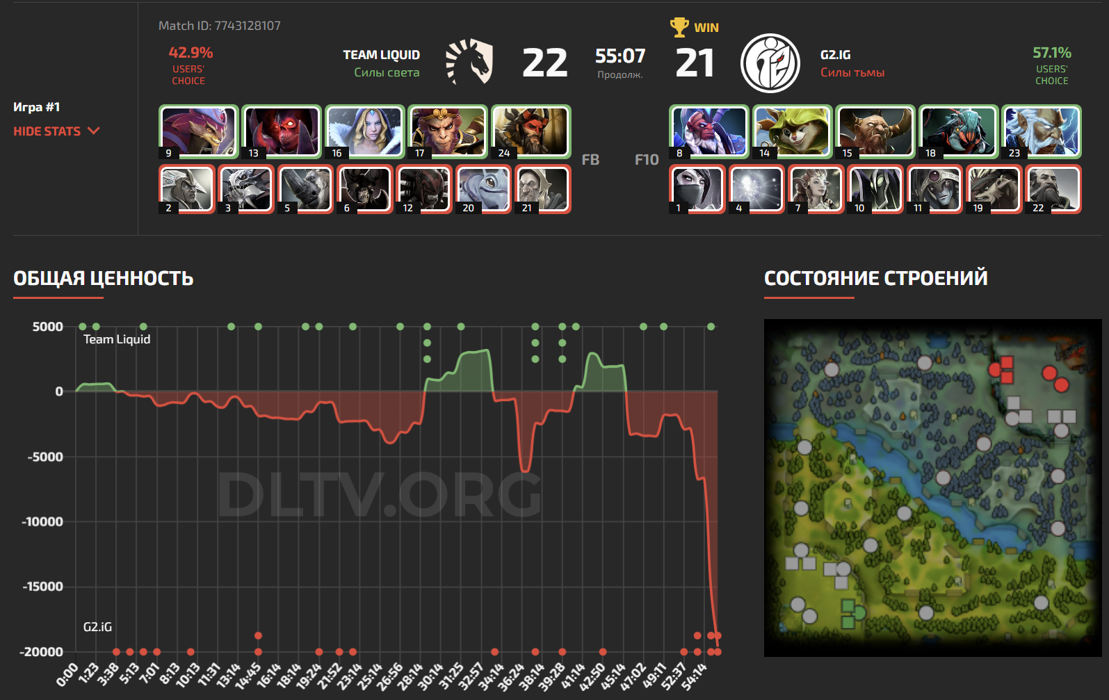 Первая карта получилась сухой на фраги, команды играли очень осторожно, так как от этого зависело их участие на этом турнире. Половину игры коллективы шли ровно, а дальше происходили американские горки. Team Liquid хорошо примут начатый G2.iG файт, но дальше кто-то умрет в одиночку. Ключевым моментом стала покупка Divine Rapier от Monet на Weaver. При защите своей последней стороны керри Поднебесной внес неожиданное для Team Liquid количество урона по Nisha на Pangolier и убил его, "жидким" пришлось отступить. Чуть позже Team Liquid застали врасплох Monet, но xNova на Disruptor нажал идеальный Static Storm с Aghanim's Scepter по троим, спас своего кора и выиграл этим мувом игру.