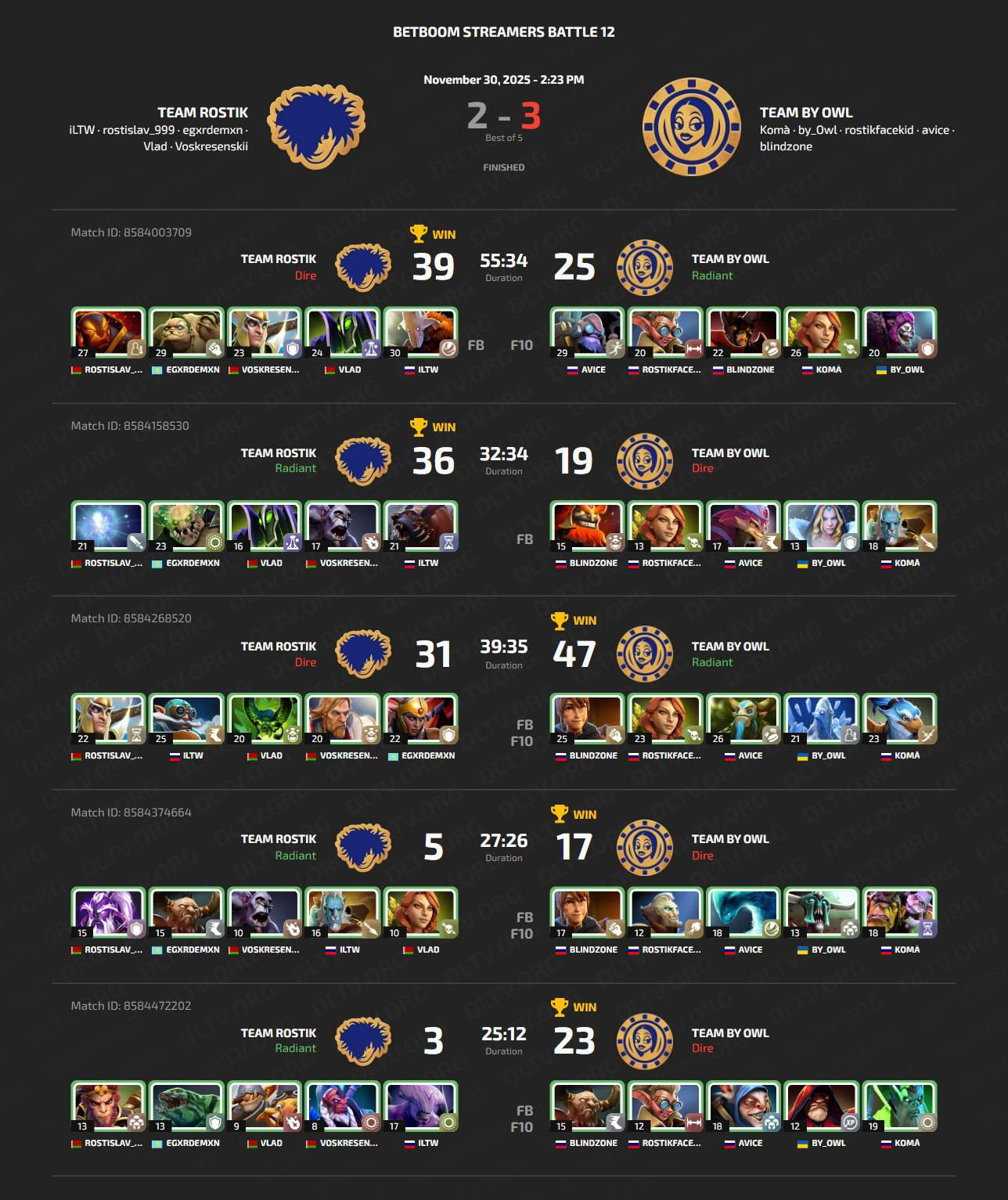 比赛开始时 Team Rostik 以两张地图大胜。在赛后采访中,Koma` 承认团队处于倾斜状态,没人再相信胜利。第三张地图改变了一切。Team by Owl 决定享受比赛并选择更适合自己的英雄。Team by Owl 的英雄在团战中表现更好,但由于大量失误,未能获得巨大优势。在第 35 分钟,Team Rostik 抓住了三个敌方英雄,从而拿下了 Aegis。在进攻高地时,Team by Owl 完成了团灭并决定进攻主基地。Team Rostik 的玩家没有买活,他们的主基地被摧毁。在接下来的两张地图中,Team Rostik 崩溃,总共只拿下了 8 个击杀。