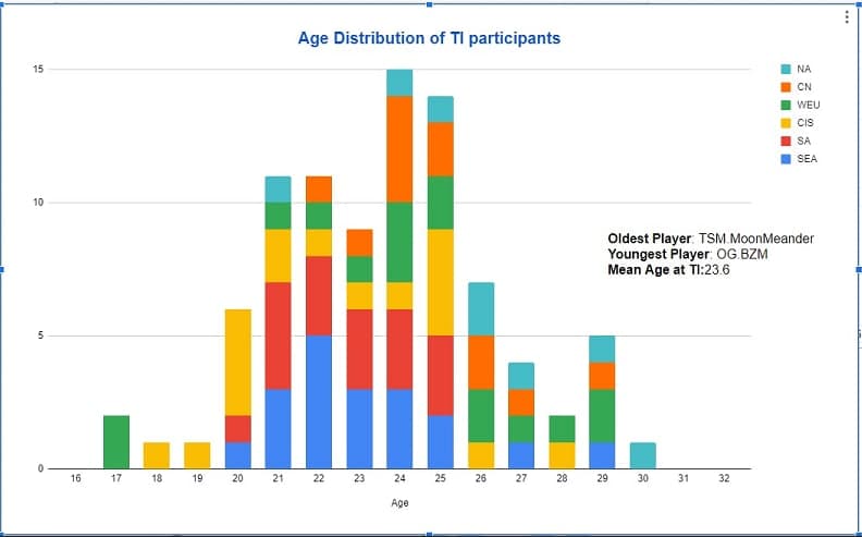 Пользователь Reddit с никнеймом JAGGI_JATT посчитал, что средний возраст участников The International 11 равен 23.6 годам. На турнире больше всего киберспортсменов в возрасте 24 и 25 лет.